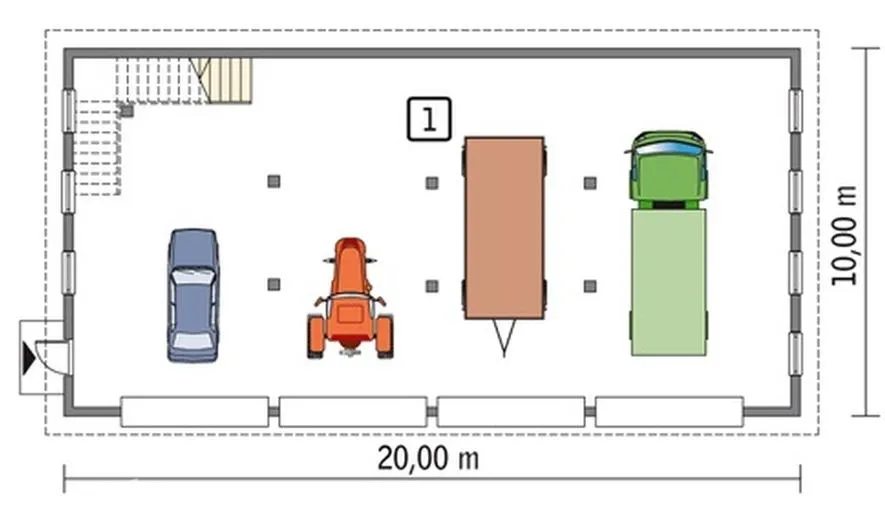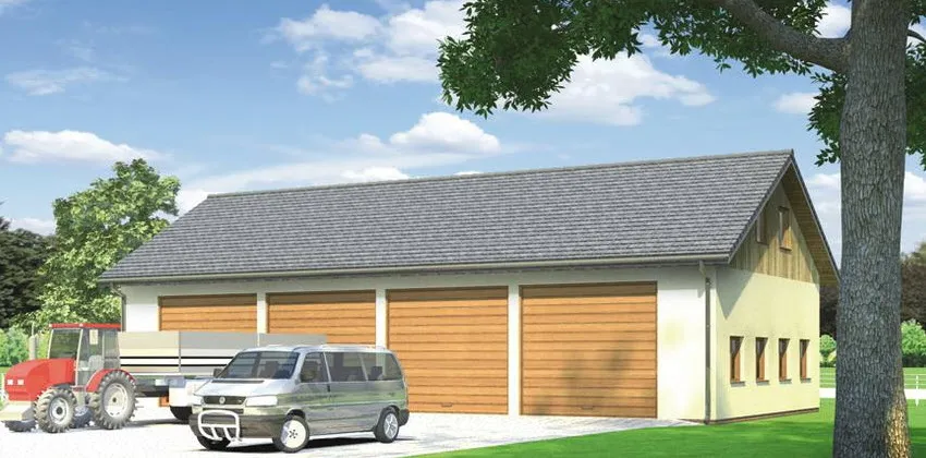 Проект гаража площадью 353,3 квадратных метра разработан с учетом специфики хранения и обслуживания фургонов и сельскохозяйственной техники. Здание спроектировано таким образом, чтобы обеспечить оптимальное использование пространства и удобство эксплуатации.